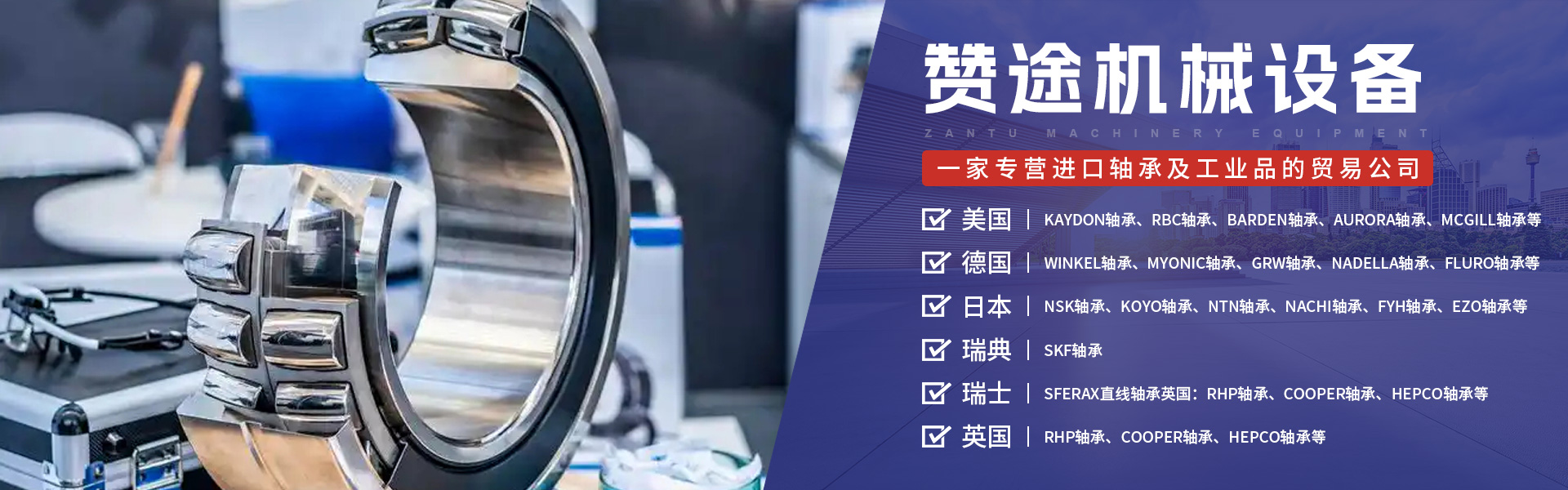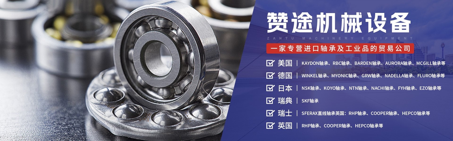 上海赞途机械设备有限公司是一家专营进口轴承及工业品的贸易公司,产品应用范围涉及煤矿、机械制造、电力、造纸业、纺织、石化、钢铁冶金等各行各业;能在短的时间为用户提供更优质的服务, 优良的品质,优质的服务,为您创造高的价值!本公司本着“以质量求生存,信誊求发展”的经营理念;专业服务,为消费者提供正品承诺!满足采购者及时供货,质量无忧的采购需求! 公司主要经营有:欧美进口轴承疑难短缺型号的期货急件(香港急件3天内到上海,新加坡急件7-10到上海,欧洲现货2-4周到上海,美国现货2-4周到上海,期货直接向国外厂家和代理商订购) 1.美国:KAYDON轴承、RBC轴承、BARDEN轴承、AURORA轴承、MCGILL轴承、CARTER轴承、FK轴承、OSBORN轴承、MRC轴承、THOMSON轴承、TIMKEN轴承、SEALMASTER轴承、SMITH轴承、NHBB轴承 2.德国:WINKEL轴承、MYONIC轴承、GRW轴承、NADELLA轴承、FLURO轴承、Nilos Ring轴承盖、ASKUBAL轴承、DURBAL轴承、FAG轴承、INA轴承 3.日本: NSK轴承、KOYO轴承、NTN轴承、NACHI轴承、FYH轴承、EZO轴承、THK轴承、NMB轴承、DAIDO衬套 4.瑞典:SKF轴承、5.瑞士:SFERAX直线轴承、6.英国:RHP轴承、COOPER轴承、HEPCO轴承等众多知名品牌。